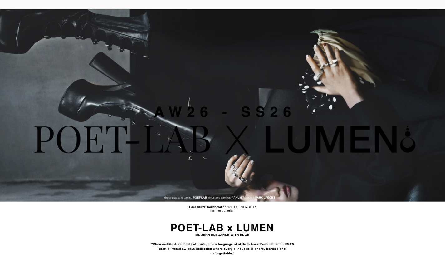 “When architecture meets attitude, a new language of style is born. Poet-Lab and LUMEN craft a Prefall aw-ss26 collection where every silhouette is sharp, fearless and unforgettable.”